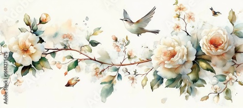 flower, bird, tree branch, leaf, watercolor, white flower, nature, delicate, blossom, green leaf, ornamental, botanical, spring, garden, elegant, pastel, peaceful, natural beauty, wildlife, ornament, artwork, decorative, fresh, blooming, calm, serene, gentle, floral arrangement, wildflower, ornate, freshness, flower petals, airy, light background, seasonal, organic, purity