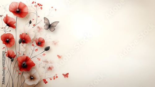 Delicate watercolor poppies with minimal details, soft red petals on a light cream background, seamless pattern