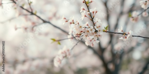 Delicate white blossoms cluster on a slender branch, bathed in soft, ethereal light, creating a gentle visual harmony.