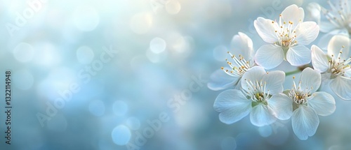 Delicate white cherry blossoms blooming in springtime against a soft blue bokeh background, symbolizing renewal and beauty