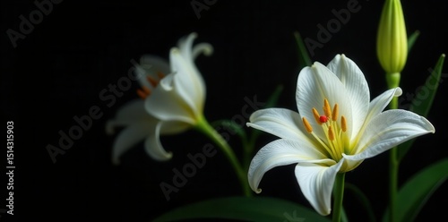 Delicate white lilies in full bloom, petals unfurled against black , oriental lily, macro, still life