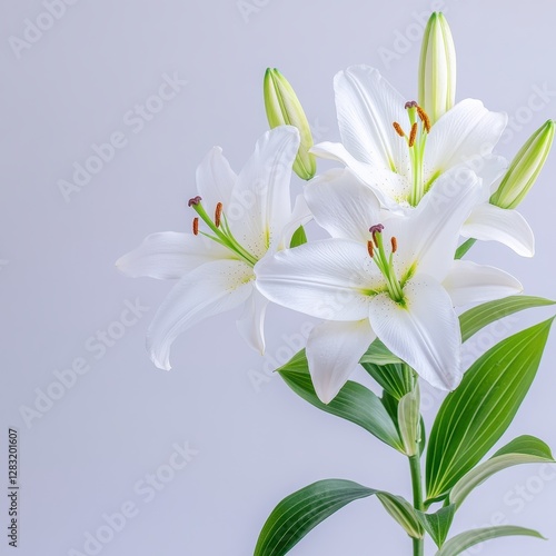 Delicate white lily flowers displayed beautifully on a pure white background emphasizing their elegance