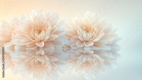Delicate white mums bloom with reflection, soft focus, serene, pastel background
