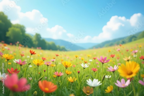 Delicate wildflowers paint a vibrant meadow under a clear sky , image, blue