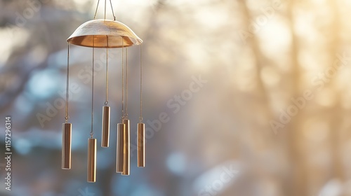 Delicate wind chime glimmers in soft sunlight, creating serene a