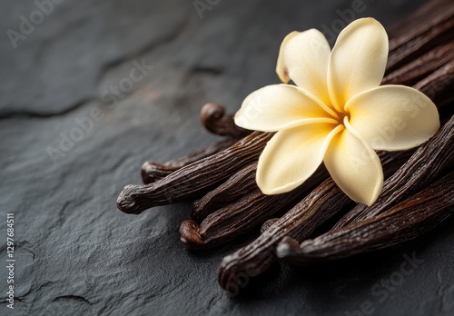flower, vanilla, bean, slate, surface, culinary, natural, beauty, fragrance, ingredient, decoration, floral, aroma, elegance, nature, organic, vibrant, tropical, still life, freshness, simplicity, culinary arts, epicure, spa, essence, creamy, tropical flower, relaxation, exotic, food, cooking, design, herbal, dessert, healthy, luxury, closeup, texture, colours, style, botany, arrangement, rustic, photo, aesthetic, botanical, sweet, unique