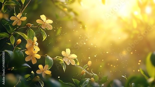 flower, yellow, green, leaf, nature, light, sunlight, floral, greenery, daylight, bloom, spring, summer, background, design, floral arrangement, visual, texture, image, copy space, natural light, detail, wallpaper, decoration, beautiful, aesthetic, peaceful, calm, serenity, calmness, macro, high-coloured