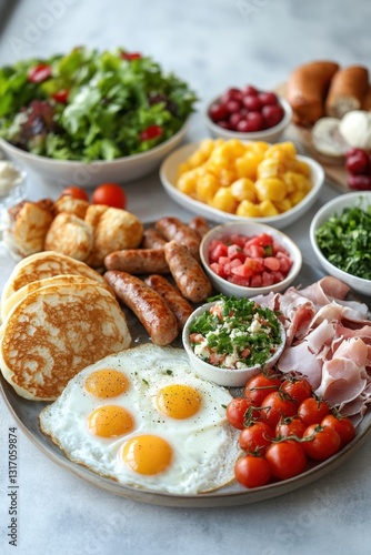 Delicious and Colorful Breakfast Platter with Fried Eggs Pancakes Sausage Ham Salad and Various Fresh Ingredients for a Wholesome Meal