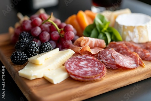 charcuterie, board, food, cheese, grape, meat, salami, fruit, blackberry, basil, epicure, platter, delicious, tasty, arrangement, assortment, snack, wooden, surface, cookery, healthy, prosciutto, colourful, fresh, variety, catering, gathering, savoury, provolone, brie, peach, culinary, indulgence, celebration, meal, rustic, organic, presentation
