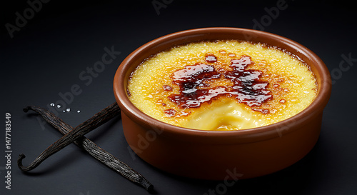 dessert, custard, vanilla, creamy, sweet, delicious, food, epicure, receipe, homemade, culinary, pastry, french cuisine, sugar, baked, topping, bowl, closeup, studio shot, dark background, elegant, indulgent, refreshing, tasty