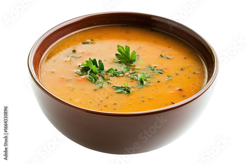 Delicious and creamy vegetable soup in brown bowl with fresh parsley topping, perfect for dinner, isolated on transparent background