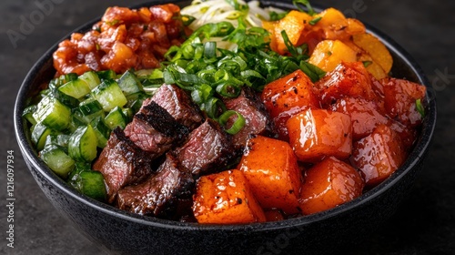Delicious and healthy beef bowl with fresh vegetables and flavorful sauce
