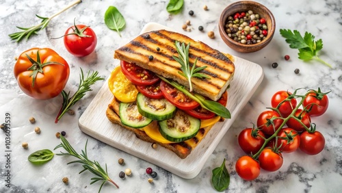 Delicious and healthy grilled vegetarian sandwich with vegetables on a white marble cutting board