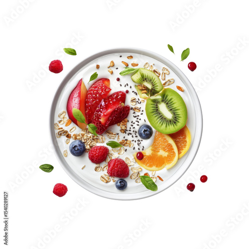 yogurt, parfait, granola, fruit, berry, raspberry, strawberry, blueberry, kiwi, orange, nectarine, peach, health food, breakfast, healthy breakfast, alimentary, delicious, fresh, vibrant, colourful, food photography, topview, white bowl, summer, spring, diet, weight loss, well-being, healthy eating, snack, dessert, tasty, deliciously, appetising