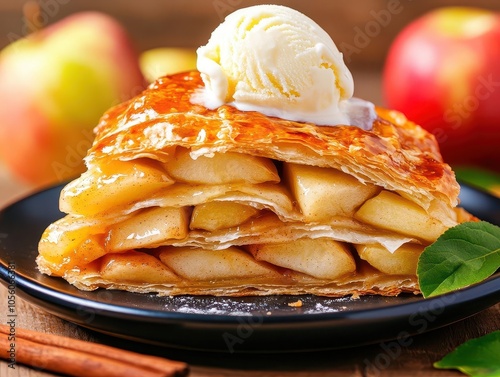 Delicious apple pastry layered with tender apples, topped with creamy ice cream and sprinkled with cinnamon for a perfect dessert.