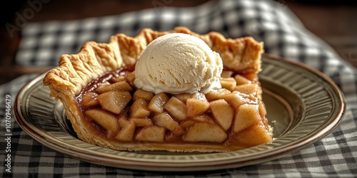Delicious Apple Pie Slice with Vanilla Ice Cream on Rustic Plate, Perfect Dessert for Fall, Featuring Lattice Crust and Fresh Apples on Plaid Background