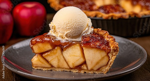 apple pie, dessert, food, ice cream, pastry, baked goods, sweet, fruit, comfort food, homemade, indulgence, warm, cinnamon, caramel, autumn, cosy, rustic, wooden table, red apple, closeup