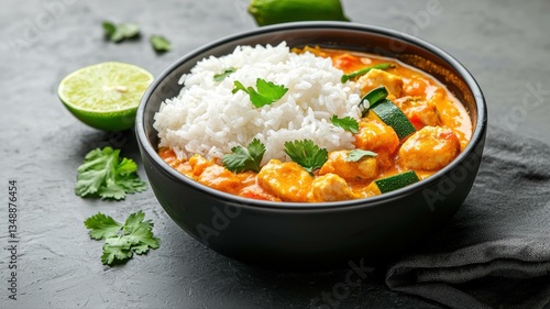 Delicious aromatic curry dish with chicken, rice, and fresh herbs, garnished with lime, served in a black bowl.