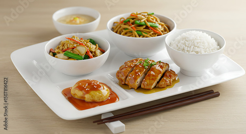 Delicious Asian Cuisine Platter Noodles Rice Chicken and Vegetables