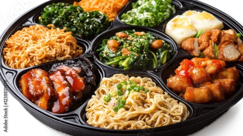 Delicious asian cuisine sampler platter with diverse noodles, meats, and vegetables