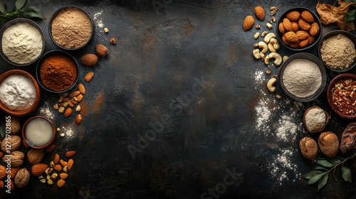 Delicious assortment of nut flours, almonds, and spices arranged beautifully on dark surface, perfect for baking and cooking