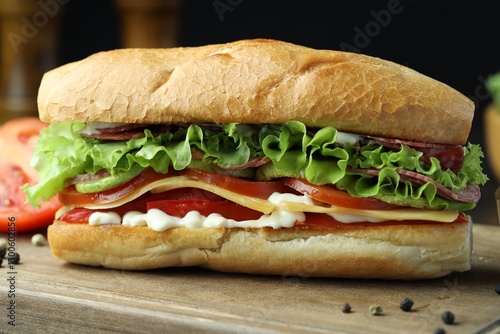 background, baguette, board, bread, calorie, cheese, closeup, cook, cooking, culinary, cut, delicious, diet, dinner, eat, food, fresh, gastronomy, epicure, healthy, homemade, ingredient, lettuce, lunch, natural, nutrient, nourishment, object, organic, peppercorn, picnic, receipe, salami, sandwich, sauce, sausage, snack, table, take-away, take-out, tasty, tomatoes, wooden, deliciously