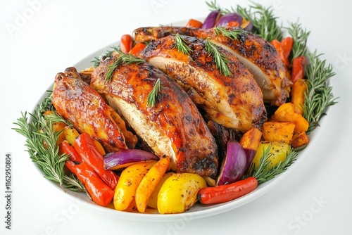 Delicious baked or broiled, juicy moist Thanksgiving turkey dinner on serving platter with vegetables. Before being carved. Pretty presentation full view Isolated on white background.