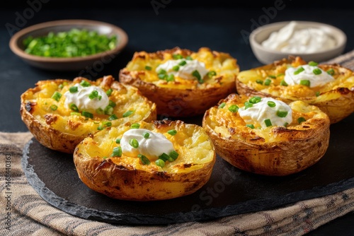 Delicious Baked Potatoes with Sour Cream and Chives on Slate Plate