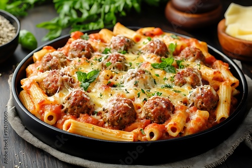 baked, meatball, italian, cookery, pasta, dish, comfort, food, cheesy, savoury, delicious, homemade, culinary, styling, art, illustration, product, photo, black, plate, meal, presentation, design, appetising, receipe, epicure, scene, realistic, drawing, kitchen, delight
