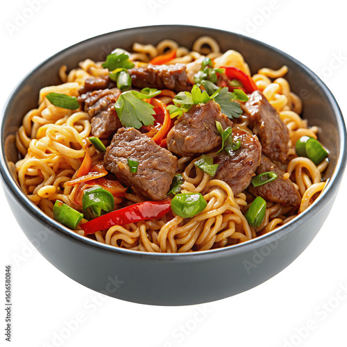 Delicious beef noodle bowl with colorful vegetables for tasty Asian-inspired dinner delight