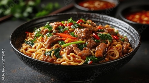 Delicious Beef Noodle Stir-fry in a Black Bowl