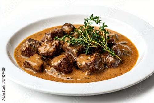 Delicious beef stroganoff with creamy sauce and fresh thyme on a white plate cuisine