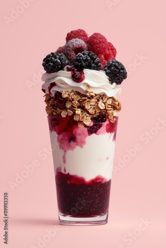 Delicious berry and granola parfait in glass