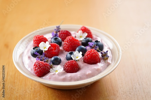 Delicious berry yogurt bowl topped with fresh fruit and edible flowers
