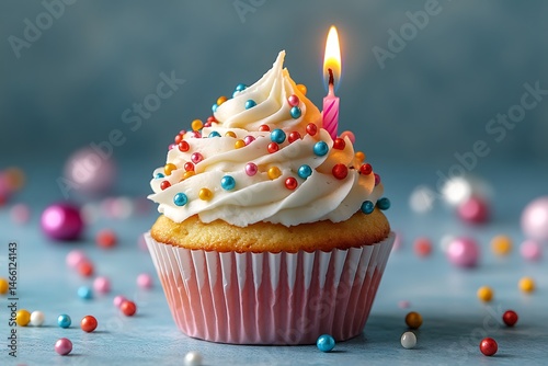 Delicious birthday cupcake with sprinkles and a lit candle against a soft blue background