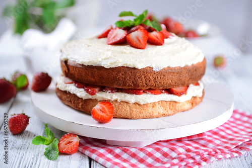 Delicious biscuit cake with strawberries on table close-up
