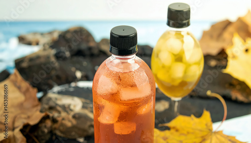 Delicious bottled sports drinks with sea coast in the background generated by AI