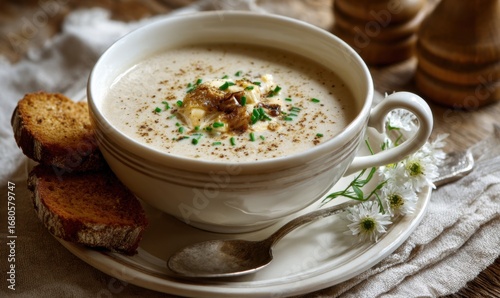 Delicious bowl of creamy soup with fresh herbs and toasted bread