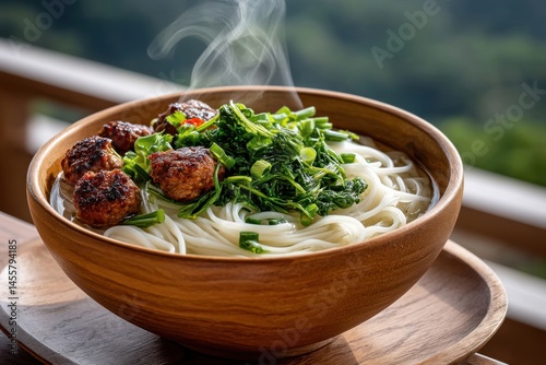 Delicious bowl of noodles with meatballs and fresh vegetables served in scenic outdoor setting