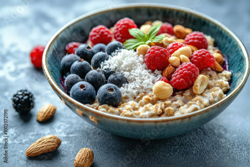 Delicious bowl of oatmeal topped with fresh berries, nuts, and coconut, creating vibrant and healthy breakfast option. Perfect for nutritious start to day!