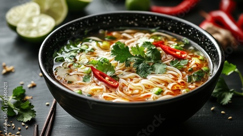 Delicious bowl of steaming noodles topped with fresh herbs and chili peppers ready to be enjoyed