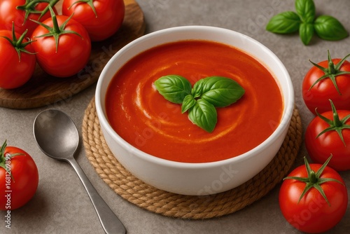 Delicious bowl of tomato-based soup garnished with fresh basil and tomatoes