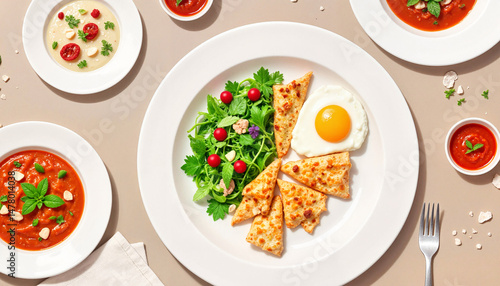 Delicious breakfast plate with salad, egg, and cheese flatbread