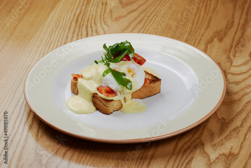 delicious breakfast sandwich with ham and salmon, cheese, egg, vegetables
