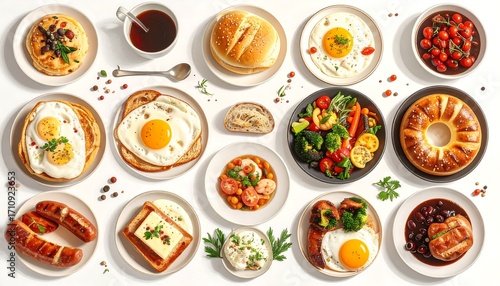 Delicious Breakfast Variety An Overhead Flat Lay of Diverse Morning Meals on a White Background