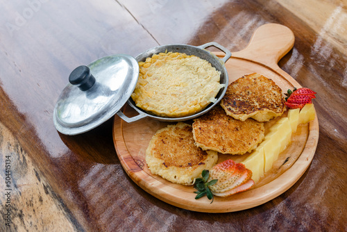 Delicious breakfast with egg and corn cake