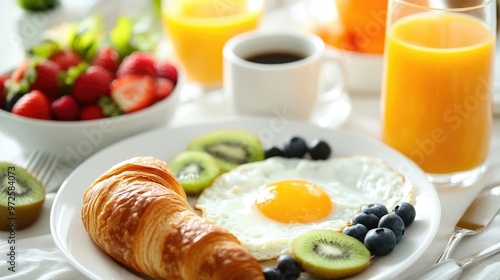 Delicious Breakfast with Fried Egg, Croissant, Kiwi and Blueberries