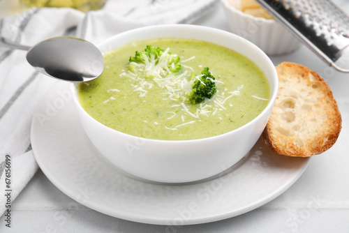Delicious broccoli cream soup with cheese served on white tiled table, closeup