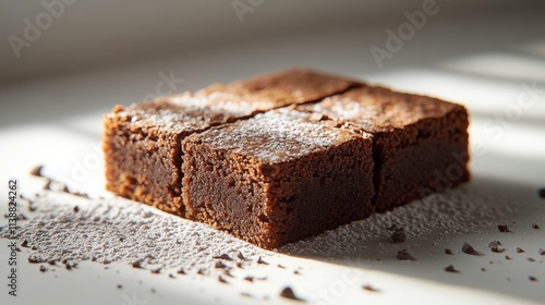 brownie, dessert, baking, chocolate, sweet, treat, cocoa, indulgent, food, square, slice, delicious, pastry, epicure, homemade, confection, powder, sugar, visual, background, lighting, warm, fresh, snack, receipe, serve, plate, portion, rich, decadent, texture, favor, arrangement, elegant, simple, component, ingredient, delectable, culinary, nature, showplace, presentation, appealing, aesthetic, mouth-watering, afternoon, creativity, enjoyment
