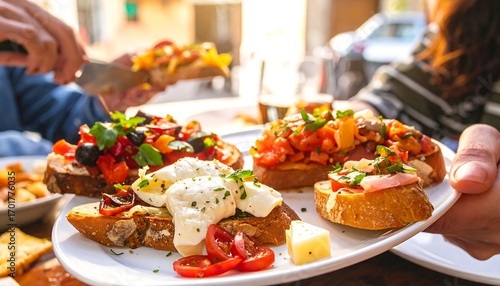 bruschetta, italian, food, dish, snack, meal, cookery, epicure, delicious, tasty, fresh, ingredient, bread, tomatoes, basil, cheese, herb, garlic, olive oil, plate, serving, eatery, cafes, dining, sunny, day, people, eating, sharing, gathering, social, lifestyle, refreshing, light, summer, lunch, appetiser, epicure, photo, closeup, texture, colours, vibrant, appetising, homemade, traditional, rustic